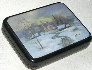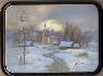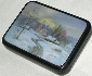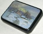 Description: A village road winds through the snow covered fields towards a small white-stoned church. Wisps of smoke rise from of the chimneys of the cozy peasant huts. The tranquil palette of light blues and whites creates a sense of peacefulness. A piece of mother-of-pearl is set into the middle of the scene to create a sparkle of the sky. Silver paint highlights the road imitating a shimmer of the snow. Very beautiful!