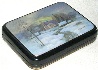 One of the most talented Fedoskino landscape painters, Sergey Parmeonov, is the author of this box. It is constructed from paper-mache. The scene painted on the box's lid is framed with a gold line; two parallel gold lines wrap around the box's sides. The lid is hinged from the top of the scene, and the box rests on a flat bottom.