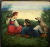 Description: Marie Galyamina from the village of Fedoskino created this originally shaped box. Here we can see a Maid playing something to a young Man.