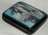 The scene is framed with a silver line. A simple pattern composed of silver metal punch-outs adorn the lid's corners.