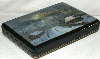 The box is constructed from paper-mache. Black lacquer is used to paint the exterior of the box while red lacquer completes the interior of the work. A hinge is fastened to the top of the scene, and the box rests on a flat bottom. The work is signed by the artist.