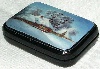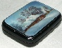 The scene is framed with a silver line. A simple pattern composed of silver metal punch-outs adorn the lid's corners.
