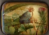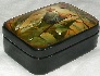 Description: This alluring box that shows the old elf sitting on the grass and thinking about something is an original work of Natalya Lavrenkova. This talented Fedoskino artist likes to paint her boxes on various fairy-tale themes. Green tones of oils dominate here. Black lacquer is used to paint the exterior of the box while red lacquer completes the interior of the work.
