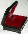 The box is constructed from paper-mache. Black lacquer is used to paint the exterior of the box while red lacquer completes the interior of the work. A hinge is fastened to the left of the portrait, and the box rests on four legs. The work is signed with the artist's name, Fedoskino and the year of 2006.