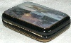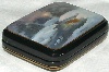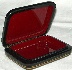 The box is constructed from paper-mache. Black lacquer is used to paint the exterior of the box while red lacquer completes the interior of the work. The lid is hinged from the top of the composition, and the box rests flat.