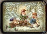 The box continues Khasanova's “Dwarf Theme”, and shows three dwarfs who carry brushwood on the sledge in the winter forest. On the box's exterior bottom the artist has drawn one more scene that depicts a stump covered with snow.