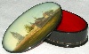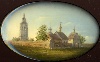 Description: This small oval box has been drawn by the talented Fedoskino painter Natalya Gogina. It shows a picturesque view of the village of Kideksha situated in the Vladimir Region, approximately 5 kilometers to the east of the town of Suzdal. The main place of interest of this village is the Church of Boris and Gleb built in 1152 that is depicted here.
