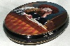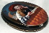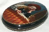 The box is constructed from paper-mache. Black lacquer is used to paint the exterior of the box while red lacquer completes the interior of the work. A hinge is fastened to the left of the portrait, and the box rests on a flat bottom. The work is signed with the artist's name.