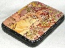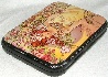 The box is made out of paper-mache. Black lacquer covers the exterior and red lacquer covers the interior of the box. The lid is hinged from the left of the composition, and the box rests on a flat bottom. The work is signed with the artist's name, the village of Fedoskino, and the year of 2008.