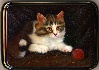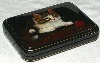 Description: Irina Kosheleva is the talented Fedoskino artist responsible for this adorable piece of Russian lacquer artistry. Here the artist has painted a kitten playing with a ball. Working on this scene the artist has managed to catch the kitten's playful mood, and express it by means of different artistic approaches. As typical of Fedoskino realism, the fur of the kitten and the expression upon its face are exceptionally executed. The artist did an excellent job in fading the reds, browns, dark greys and whites in and out of one another. Gold metal powder is mixed with the oils to produce a sparkle of the background.