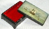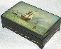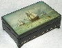 The box is made out of paper-mache. Black lacquer covers the exterior and red lacquer covers the interior of the box. The lid isn't hinged, and the box rests on four feet. The work is signed with the artist's name, Fedoskino, and the year of 2006 on the box's exterior bottom.