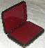 The box is constructed from paper-mache. Black lacquer is used to paint the exterior of the piece while red lacquer completes the interior of the box. The lid is hinged from the left side of the composition, and the box rests on a flat bottom. The work is signed by the artist.