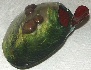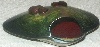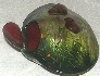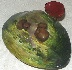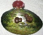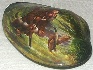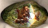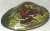Description: This interesting work is a creation of Miroshnichenko. The piece is made out of the unbroken cockleshell, and shows the hunter hunting for the ducks standing in the cold water of the marshy pond. The entire exterior of the piece is covered with miniature painting that depicts a mirror like surface of the pond surrounded with fresh grass and plants. Some areas of the shell are not covered with oils to create a blue-pinkish brilliance of the water. The interior of the box is covered with red lacquer. Several stones that are crafted three-dimensionally are attached to the piece on which the piece rests on. The piece has a small lid that is hinged. The work is signed with the artist's name written on the lid's interior.