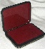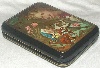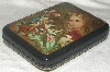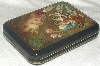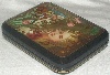 The box is constructed from paper-mache. Black lacquer is used to paint the exterior of the box while red lacquer completes the interior of the work. A hinge is fastened to the left of the scene, and the box rests on a flat bottom. The work is signed with the artist's name.