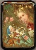 This scene is an adorable look into the climax of the tale. The young girl has finally made it to the glass mountain where her brothers live, as ravens, with the dwarf to the left. Soon, the spell will be broken and the ravens will turn back into there human form. This is a most joyous occasion, furthered by the masterful facial expressions composed by the artist. Shimmering gold leaf adds a radiant glow to the composition. The leaves falling down from the tree, chair of the dwarf and the crowns atop the raven's heads are all comprised of the gold leaf. The scene is framed with a gold line; the box's sides are decorated with two parallel gold lines.