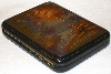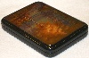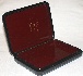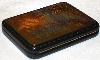 The box is constructed from paper-mache. Black lacquer is used to paint the exterior of the box while red lacquer completes the interior of the work. The lid is hinged from the left of the scene, and the box rests on a flat bottom. The work is signed with the artist's name in the corner of composition and also inside the lid.