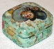 Description: This small box is a creation of T. Volodina from the village of Fedoskino. It features the clown giving a small concert. Mother-of-pearl shines through his top hat, and through his goffered collar. Gold metal leaf details his hat and collar, and also shines through the signs of sheet music scattered throughout the composition. The clown is painted in bright oils against the light green background.