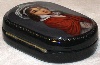 The box is made out of high quality paper-mache. Black lacquer covers the exterior and red lacquer covers the interior of the box. The lid is hinged from the left of the portrait, and the box rests on a flat bottom. The work is signed with the artist's name, the village of Fedoskino, and the year of 2008.