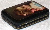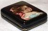 The box is constructed from paper-mache. Black lacquer is used to paint the exterior of the box while red lacquer completes the interior of the work. The lid is hinged from the left of the portrait, and the box rests on a flat bottom. The work is signed with the artist's name.