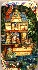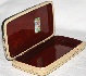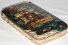 The house is painted in cream and brown tones whereas the surrounding landscape is painted in green tones. Mother-of-pearl inlays that have bright orange, green, violet and pink undertones shine through the leaves of a water lily painted in the foreground. Pearl beads are glued to the exterior of the lid to create a magic atmosphere throughout the scene. Gold powder is used to decorate the maiden's costume and some elements of the architecture. The box's sides and the upper and bottom corners of the lid are decorated with an original pattern composed of very thin bands painted over metallic powders.