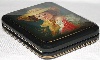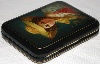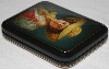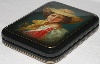 The box is constructed from paper-mache. Black lacquer is used to paint the exterior of the box while red lacquer completes the interior of the work. The lid is hinged from the left of the portrait, and the box rests on a flat bottom. The work is signed with the artist's name, the year of 2008 and the village of Fedoskino.
