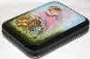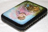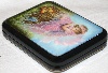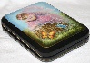 This charming box has been painted by Tatiana Levko. It depicts a little fairy sitting on the stub, and looking dreamily at the bright butterflies flying nearby. The scene is painted in light blue, pink, green and brown oils. The stub is painted over gold metal powder that shines beautifully through the oils.