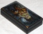 The box is constructed from paper-mache. Black lacquer is used to paint the exterior of the box while red lacquer completes the interior of the work. The lid is hinged from the left of the scene, and the box rests on a flat bottom. The work is signed with the artist's name, the year of 2008 and the village of Fedoskino.