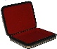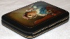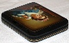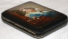 The box is constructed from paper-mache and rests on a flat bottom. A hinge is fastened at the left. Black lacquer is used to paint the exterior of the box while red lacquer completes the interior of the work. Signed by the artist at the bottom of the portrait. Excellent work!