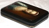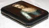 The portrait is framed with a gold line. Two parallel gold lines decorate the box's sides.