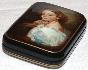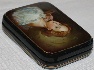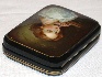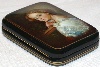 The box is constructed from paper-mache. Black lacquer is used to paint the exterior of the box while red lacquer completes the interior of the work. The lid is hinged from the left of the portrait, and the box rests on a flat bottom. The work is signed with the artist's name.