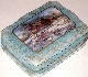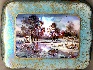 The landscape is painted in the realistic style in delicate white and blue oils. Mother-of-pearl is set into the sky to create the radiant glow of the sunset, and into the big puddle that reflects the sunset glow.