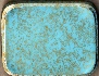 The box's exterior is covered with soothing light blue paint, and decorated with gold blurry spots. Its interior is traditionally covered with red lacquer. The Fedoskino "troika" insignia can be found on the interior of the lid.