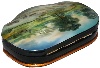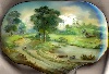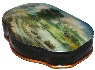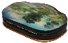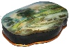 Description: This beautiful summer landscape is a creation of Igor Dunaev. This talented Fedoskino artist is fond of painting Russian nature. He tries to excel the beauty of Russian countryside almost in each of his works. The landscape is masterfully painted in green and light blue oils. This rather monotonous palette is enlivened by a large shimmering piece of mother-of-pearl that is set into the sky. The bottom part of the box's base is decorated with a wide, bright gold band.