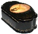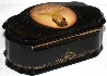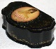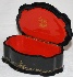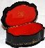 The box is made out of high quality paper-mache. Black lacquer covers the exterior and red lacquer covers the interior of the box. The interior also includes the Fedoskino "troika" insignia stamped in orange paint on the roof of the lid.