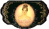 The box is carved into a rectangle with ruffled sides to the right and left, and a rounded side towards the compositional bottom. The lid's surface to the left and to the right of the portrait is adorned with large gold floral patterns. The edges of the lid are decorated with a simple gold scrolling design. The sides of the box are adorned with more complex and big scrolling design.