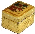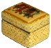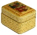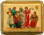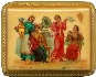 Against a creamy yellow background the artist paints the women from a palette of diverse yet bright colors. On the very limited space of this box Mitusov finely details the clothing and the furniture to create a believable world in this composition. Gold metal leaf mixed with oil paint, is used to accentuate the colors in the scene and also bring in more light.