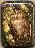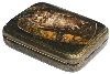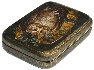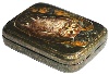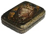 This small box that depicts the owl sitting on the fir tree is creation of Taisia Danchenko from the village of Fedoskino. The scene is painted in various shades of brown oils over gold metal powder that shines beautifully through the owl's feathers and through the tree. Gold paint is used to create a sparkle of the plants depicted in the right bottom corner of the scene and needles of the fir tree. Lustrous gold metal leaf is inlaid into the background the owl is painted against. The scene is framed with a thin gold band. The edges of the lid are decorated with elegant gold patterns. The box's exterior imitates a stone color (it is covered with very thin gold and green veins), while the interior is traditionally covered with red lacquer.