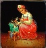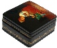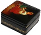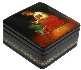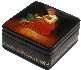 This small box was painted by Fedoskino artist M. Minaeva. The composition shows a young girl admiring a necklace. She has opened her grandmother's secret malachite jewelry box. Babushka has accumulated numerous treasures from over the years. Some were purchased at the Yarmarka fair, some were passed on from the bygone era of grand grand parents. In old times boxes like this one served as dressing tables where girls kept their treasures and cosmetics.