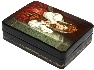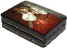 The painting takes up the entire lid of this rectangular piece and has no border. Instead, it seems to fade away to black at the edges. The lid is hinged to the left of the scene and the box has a flat base. The box's sides are decorated with elaborate gold leafy patterns.