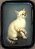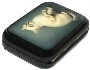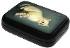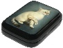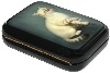 Dudkina Irina from the village of Fedoskino created this small box that depicts a cat. Here she managed skillfully reproduce anatomical features of the animal. The beautiful light grey background harmonizes with the cat's blue eyes.