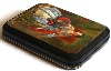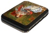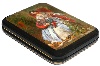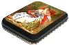 The box is constructed from paper-mache. Black lacquer is used to paint the exterior of the box while red lacquer completes the interior of the work. The lid is hinged from the left of the portrait, and the box rests on a flat bottom. The work is signed with the artist's name, the year of 2009 and the village of Fedoskino. Beautifuly done!
