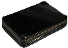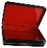 The box is constructed from paper-mache. Black lacquer is used to paint the exterior of the box while red lacquer completes the interior of the work. A hinge is fastened to the left of the scene, and the box rests on legs. The work is signed with the artist's name.