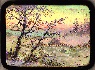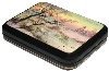 Description: This peaceful winter landscape is a creation of Tatyana Tipyakova. The white snow and the icy river reflect pink and orange tones of the sunset. The wooden peasant houses depicted in the background help to create the depth of the composition. Pieces of mother-of-pearl that shine with pink, blue, green and yellow undertones imitate a sparkle of the icy river. Gold dust spread throughout the scene fill it with a magic glow.