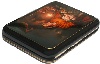 The box is made out of paper-mache. Black lacquer covers the exterior and red lacquer covers the interior of the box. It has a hinge from the left of the composition and rests flat. The box is signed by the artist.