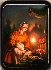 This brilliant work was made by Dokuchev Alimpiada from the village of Fedoskino. It features the girl buying vegetable and fruits in the market at night. The scene is painted in the realistic style, and it is notable for depiction of people and various vegetable and fruits alight by scanty light of burning candles. This stunning visual effect is very difficult to produce.