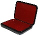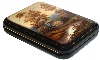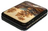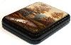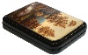 The box is constructed from paper-mache. Black lacquer is used to paint the exterior of the box while red lacquer completes the interior of the work. The lid is hinged from the left of the scene, and the box rests on a flat bottom. The work is signed with the artist's name.
