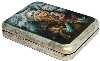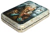 Working on this box the artist has used the delicate palette filled with cold blues. This palette is enriched and enlivened by gold metal leaf inlay that can be found in the Snowmaiden' hair, patterns on her costume and on the birds' breasts. The box's exterior is covered with light grey lacquer. For additional decoration this light grey background is studded with brilliant gold spots. The box's interior is traditionally covered with red lacquer.