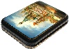 The entire scene is drawn over a piece of golden foil that shines brightly with yellow and blue undertones. The scene is framed with a wide gold band. The wide gold ornament also wraps around the edges of the lid.