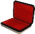 The box is constructed from paper-mache. Black lacquer is used to complete the exterior of the piece while red lacquer completes the interior of the box. The lid is hinged from the left of the scene, and the box rests on a flat bottom. The work is signed with the artist's name, and the village of Fedoskino.
