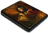 Her noble face is realistically painted, especially her widely opened eyes and complexion. She is dressed in the rich attire that reflects the fashion of medieval epoch. The ruffles of her dress are precise but natural. The interior of the cathedral where the woman is sitting is painted in brown tones. Gold powder is used to paint the window to create an illusion of sunrays penetrating into the cathedral through the window glass.